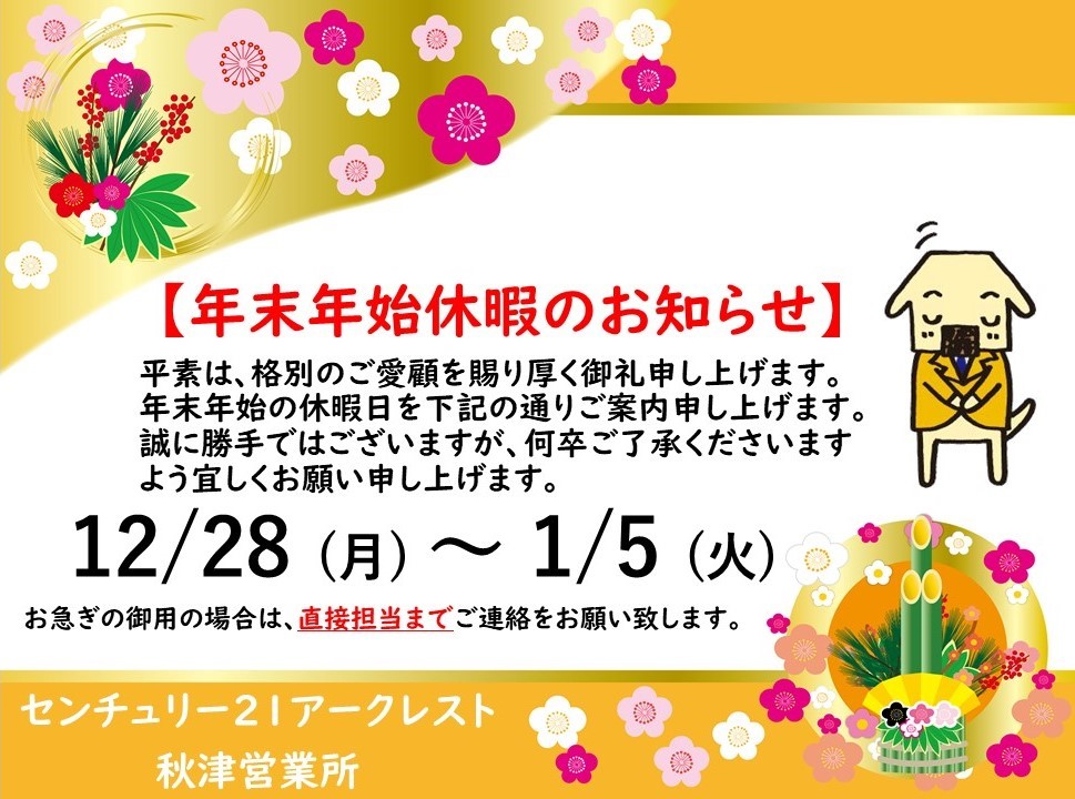 誠に勝手ではございますが、下記の内容で年末年始休暇とさせていただきます。