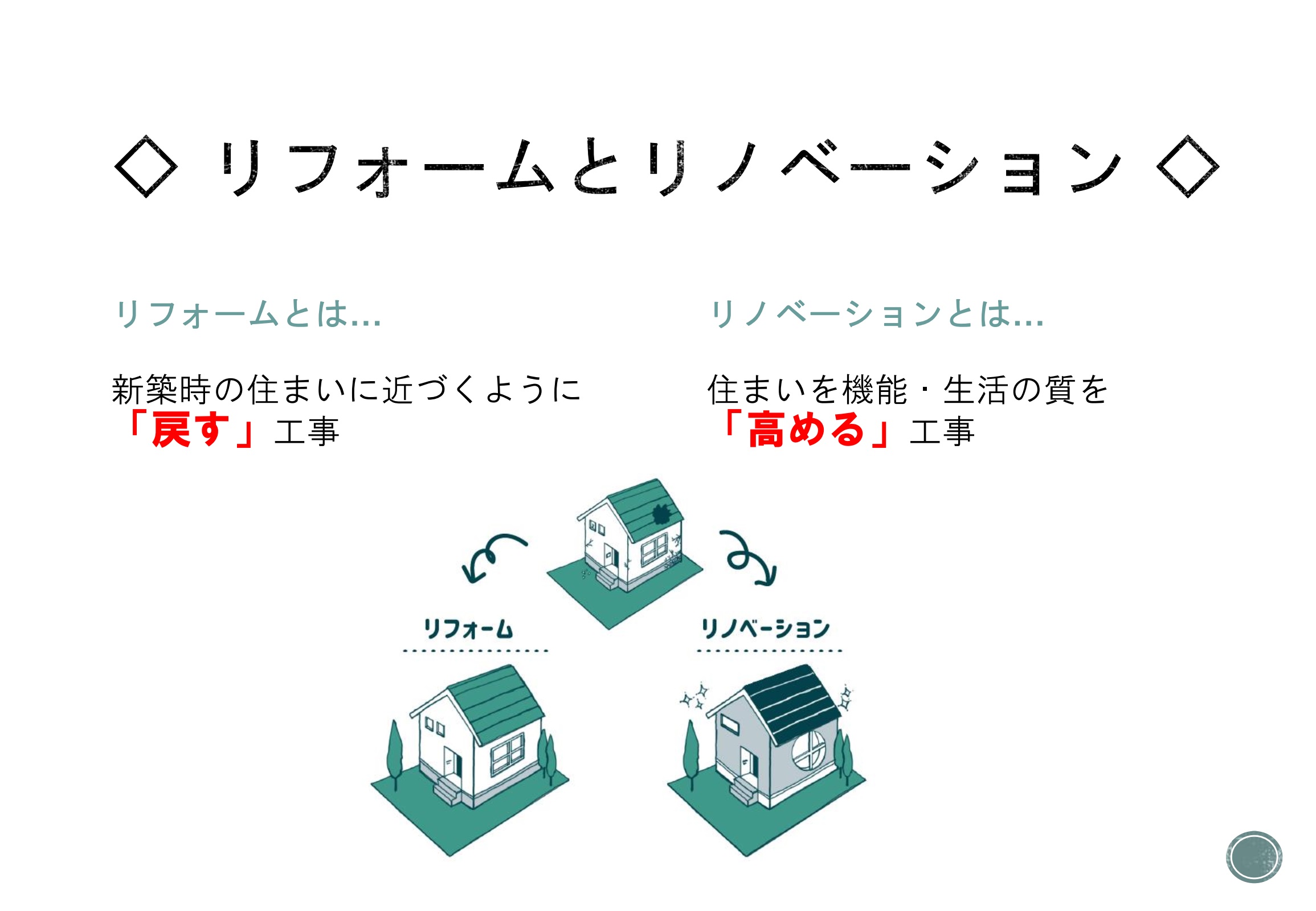 リフォームとリノベーションの違いは、工事によって目指すゴールの違いなのですね!