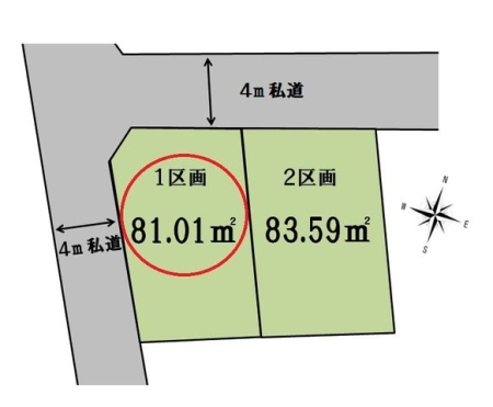 | 現況/引渡し | 更地/即時 | 接道状況 | 接道: 南西 私道 道路幅: 4m 接道: 北西 私道 道路幅: 4m |