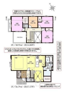 | セールスコメント | ●3LDK+サービスルーム(1号棟)、4LDK(2号棟) ●吹き抜け ●床暖房のある約20帖LDK ●WIC、SIC ●ランドリールームとして使用できるスペースのある広めの洗面脱衣所 ● 20帖超の広々LDKを採用し、家族が自然と集まりやすい住空間 ● 吹抜けを設けることで、明るさと開放感を感じやすい室内設計 ● 各所に収納スペースを確保し、日用品や季節物も整理しやすい住まい ● 収納力を意識した間取りで、住空間をすっきり保ちやすい ● 生活動線に配慮し、家事や身支度がスムーズに進む設計 ● LDKを中心に、家族のコミュニケーションが取りやすい間取り構成 ● ZEH水準住宅のため、断熱性・省エネ性にも配慮 ● 水まわりをまとめた配置で、日々の家事効率をサポート ● 落ち着いた住宅街に位置し、穏やかな暮らしを送りやすい住環境 ● 使いやすさと空間のゆとりを両立した、新築分譲住宅 |