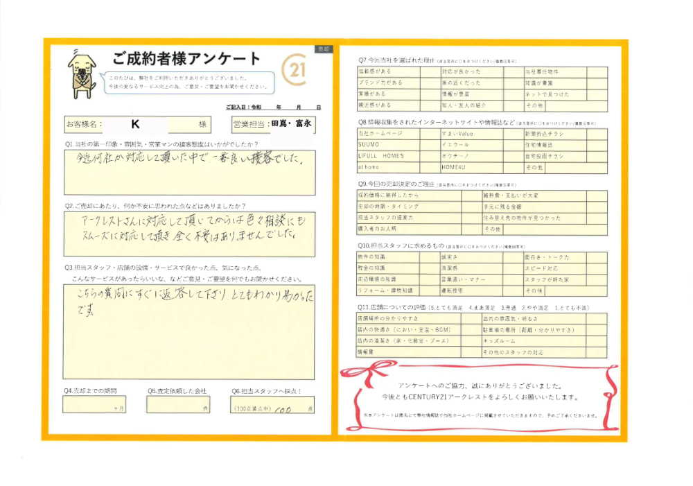 アークレストさんに対応していただいてからはいろいろ相談にもスムーズに対応していただき全く不安はありませんでした。