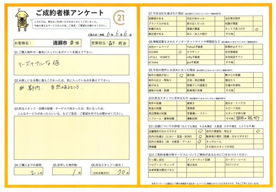 R6.6.6 清瀬市 D様 | ご購入成約事例|おうちの仲介+(株式会社アークレスト)
