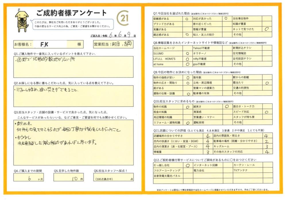 F.K様とはたくさんの物件を見ていく中で、いつも楽しく明るく接してくださり、私たちも楽しい時間を過ごすことができました!