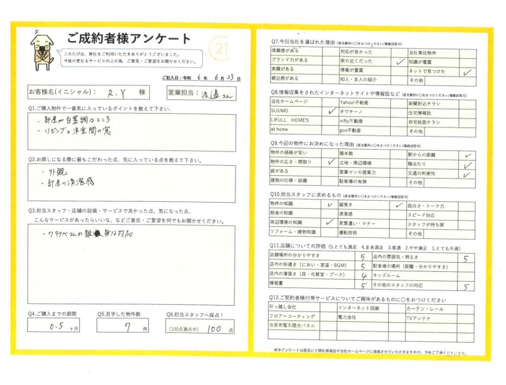 R.Y様がご納得のいくお住まいに出会えたことを大変うれしく思います。