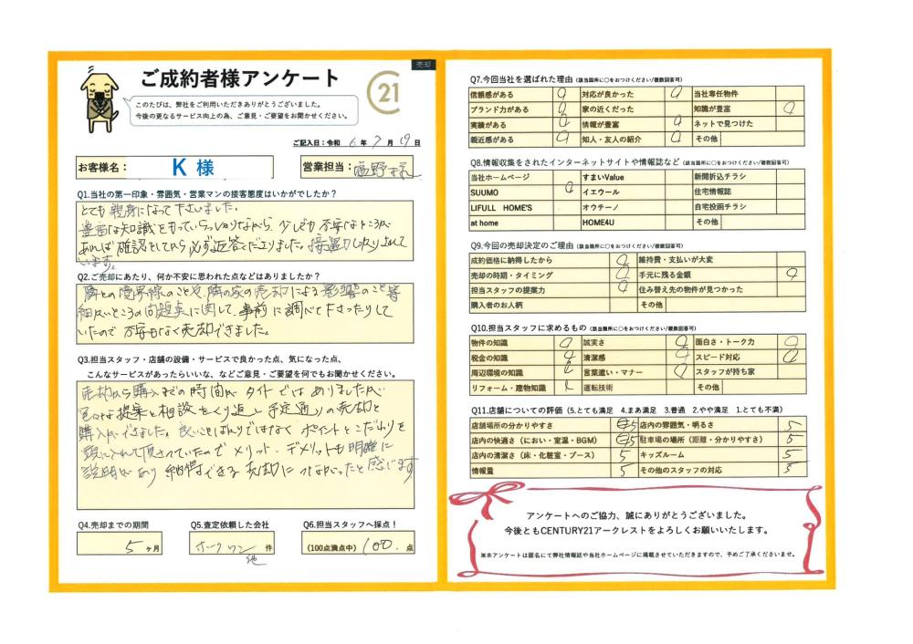 隣との境界線のことや、隣の家の売却による影響のこと等細かいところの問題点に関して、事前に調べて下さったりしていたので不安もなく売却ができました。