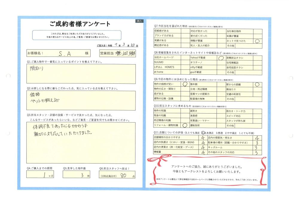 R7.3.23 入間市 S.A様 | ご購入成約事例|おうちの仲介+(株式会社アークレスト)