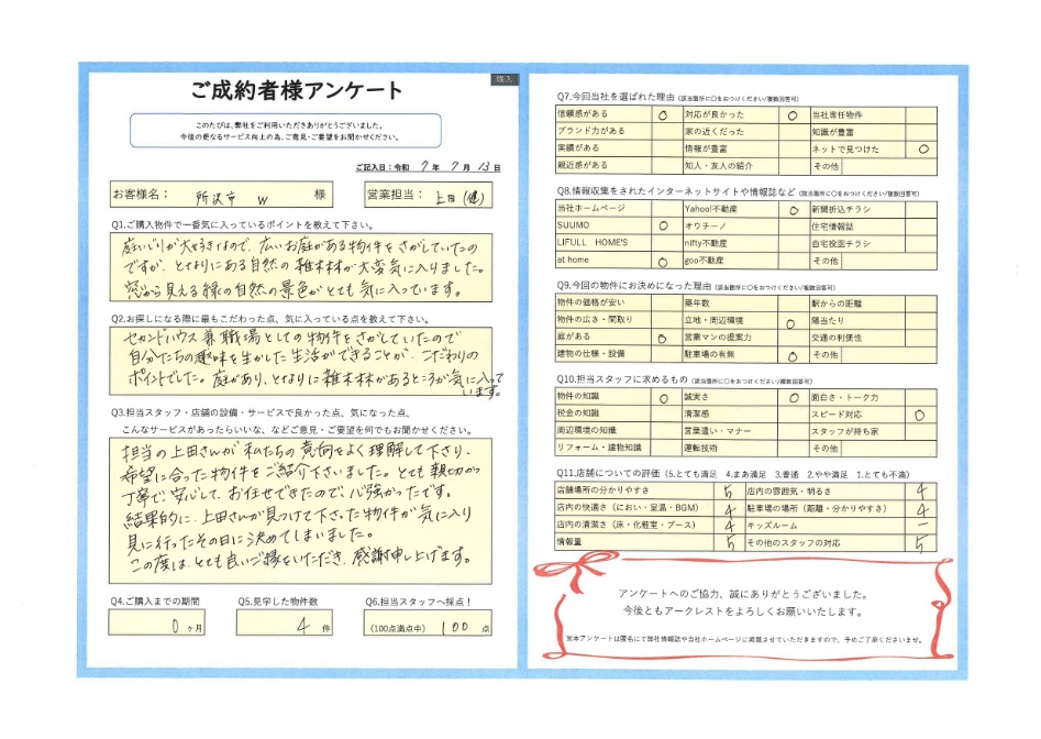 W様、この度は私にセカンドハウスのご購入のお手伝いをさせていただき、誠にありがとうございました。