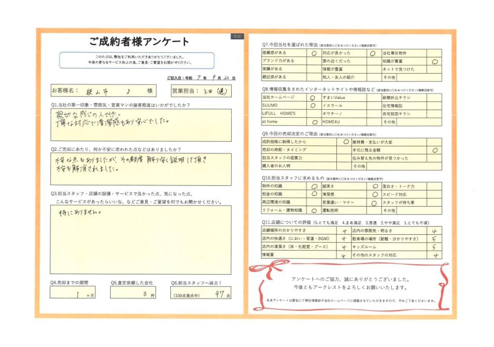 S様、この度は大切なご所有不動産のご売却を私にお任せいただき誠にありがとうございました。