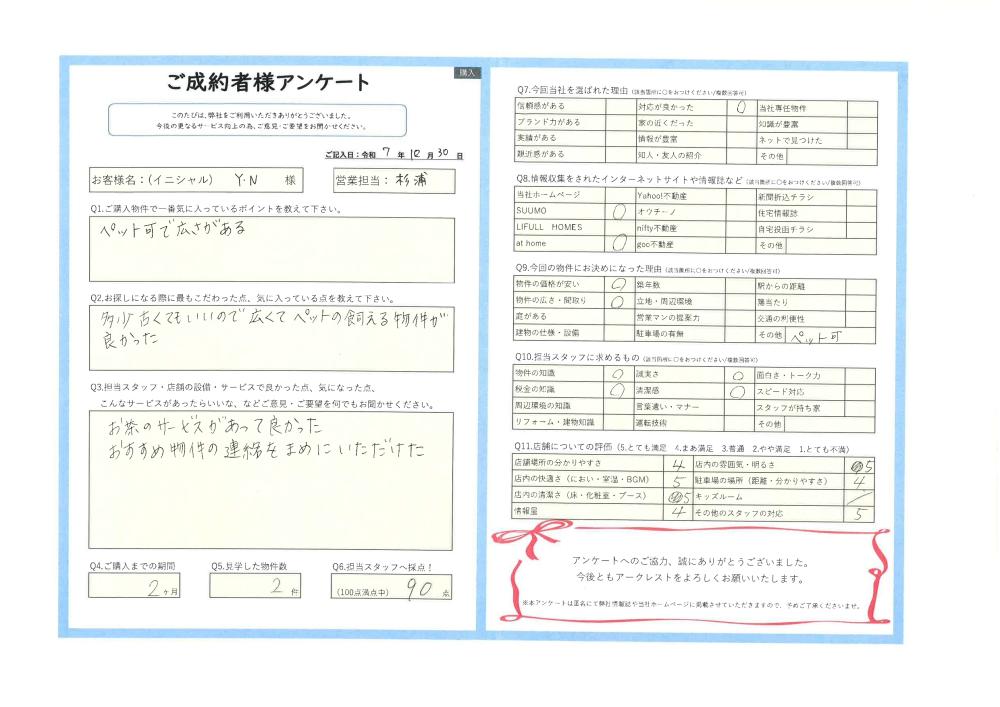 R7.10.30 西東京市 YN様 | ご購入成約事例|おうちの仲介+(株式会社アークレスト)