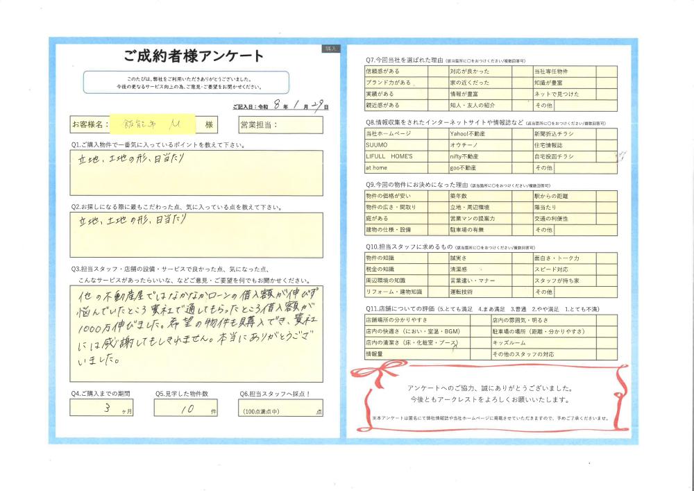 他の不動産屋さんではなかなかローンの借入額が伸びず悩んでいたところ貴社で通してもらったところ借入額が1000万伸びました。希望の物件も購入でき、貴社には感謝してもしきれません。本当にありがとうございました。
