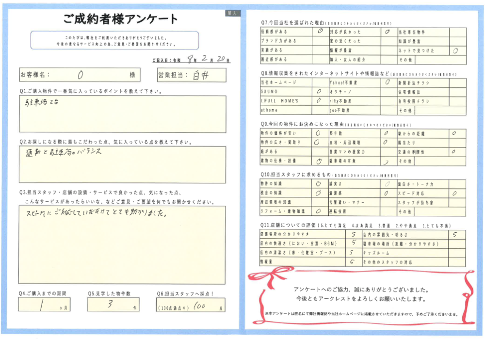お申し込みをした物件が売り止めになってしまう状況などもありましたが、お忙しい中にも関わらずこまめにご連絡くださったおかげで、こうして駐車場の広さや立地を気に入ってくださる物件とご縁を結んでいただくことができました。