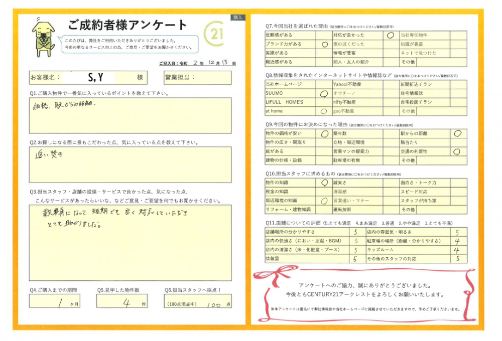 この度は弊社アークレスト秋津営業所をご利用いただき、また物件をご契約いただき誠にありがとうございました。