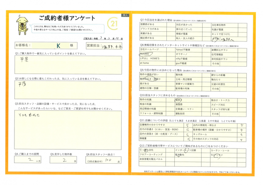 今回、K様のお住まい探しをさせていただきましたこと、大変嬉しく思っております。