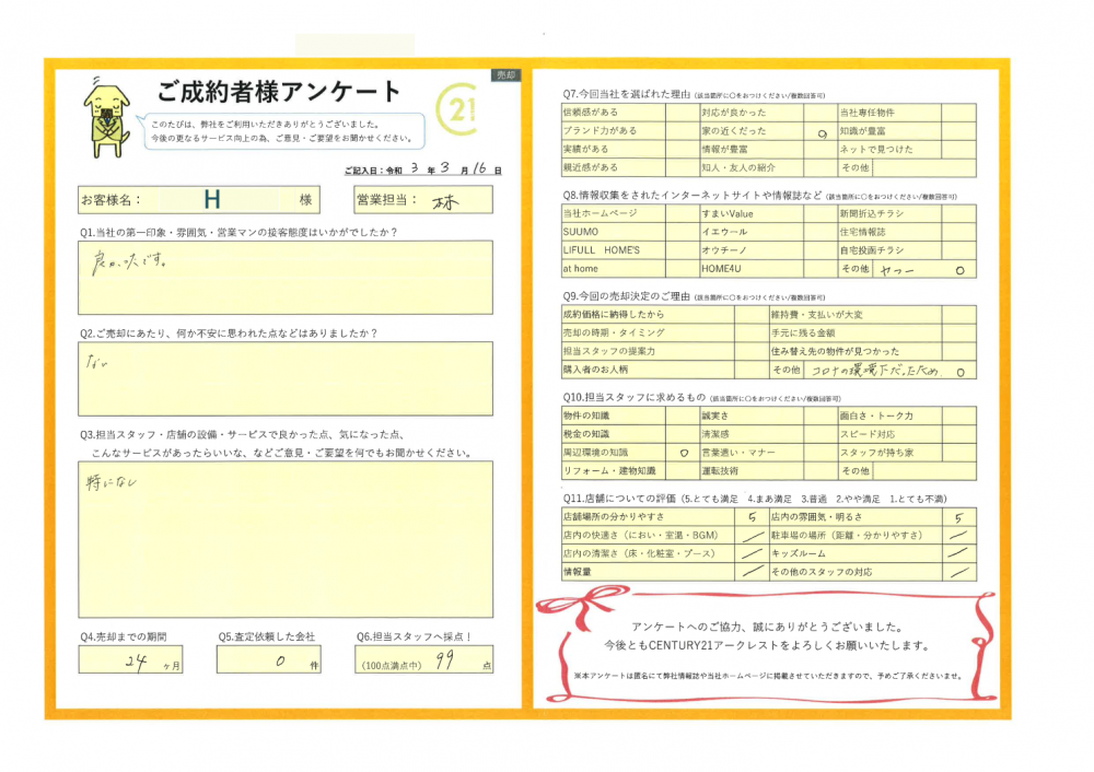 H様の不動産のご売却についてお任せいただき、最後までお手伝いさせていただけましたこと、大変誇りに思います。