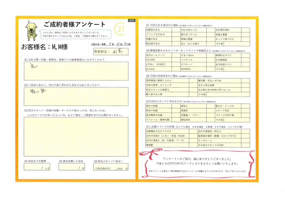 M様の室内のご見学やお電話のご対応など、ご協力いただいたことがご成約に繋がったことと思います。