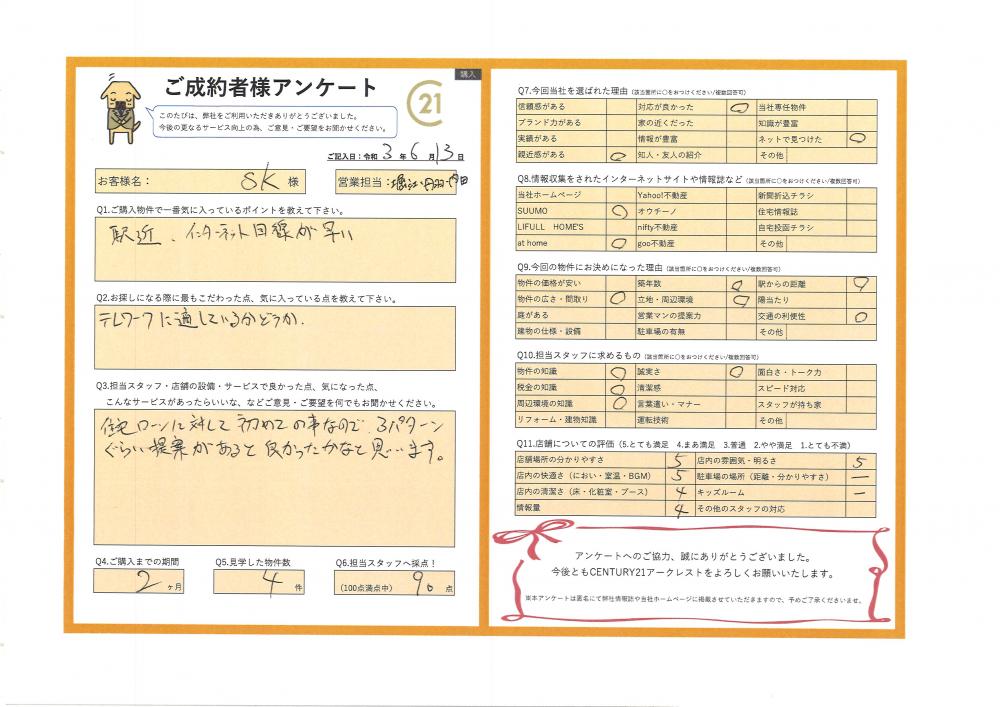 そしてご案内からもご決断が非常に素早く、他者様に関与されることなくご契約まで運べたのは素晴らしいと思いました!