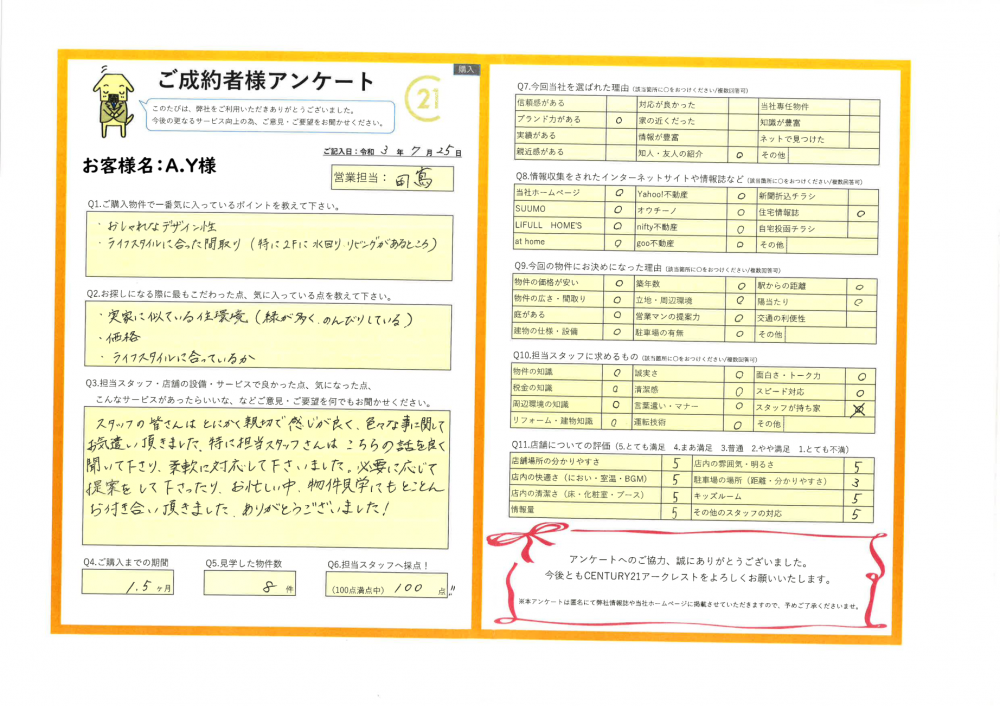 物件のご見学時には、多くのご質問をいただき、また、私からのご提案もたくさん受け入れていただき、A様と一緒に素敵な物件にたどり着くことができたように思います!