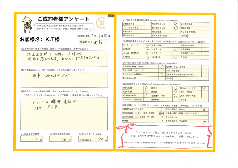 ご売却活動にご不安がありながらも、1ヶ月でのご成約をすることができ、K様のお役立てができたことを大変嬉しく思います。
