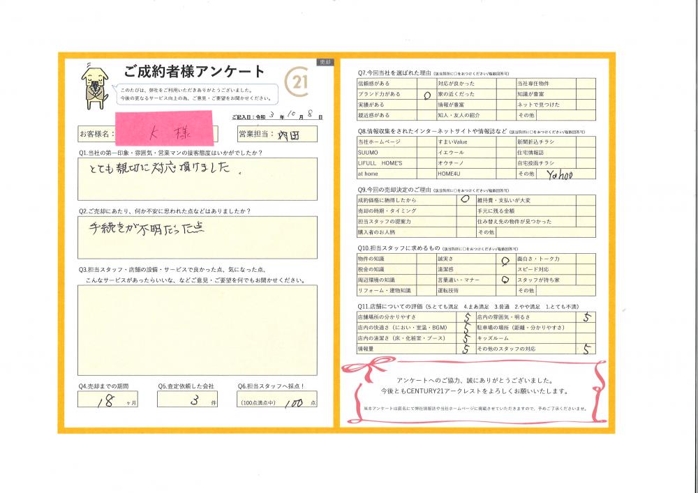 物件自体の築年数もあり、ご成約までは長期となりましたがK様にも金額面や売却方法についてご協力いただき大変心強かったです!