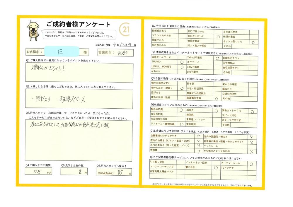 スタートは、お問い合わせいただいたマンションが接客途中でお申し込みが入ってしまうという決して「良い」とは言えないスタートでしたがそれでも諦めずに探し続けてくれたE様のおかげで最終的に新築戸建てでのご契約を無事行うことができたと思います!