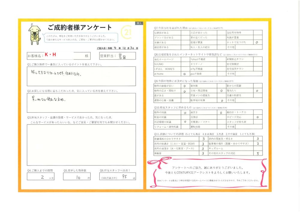 この度は弊社に不動産ご購入をお任せいただきまして誠にありがとうございました。