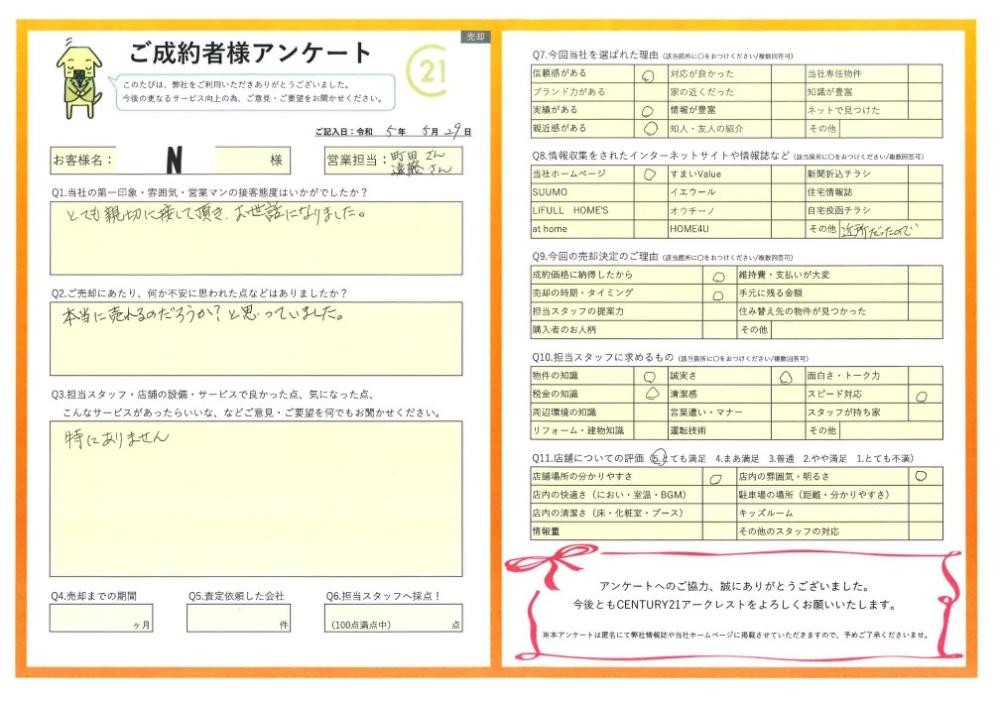 N様の思い出の詰まった大切な不動産のご売却サポートができ、大変嬉しく思っております。